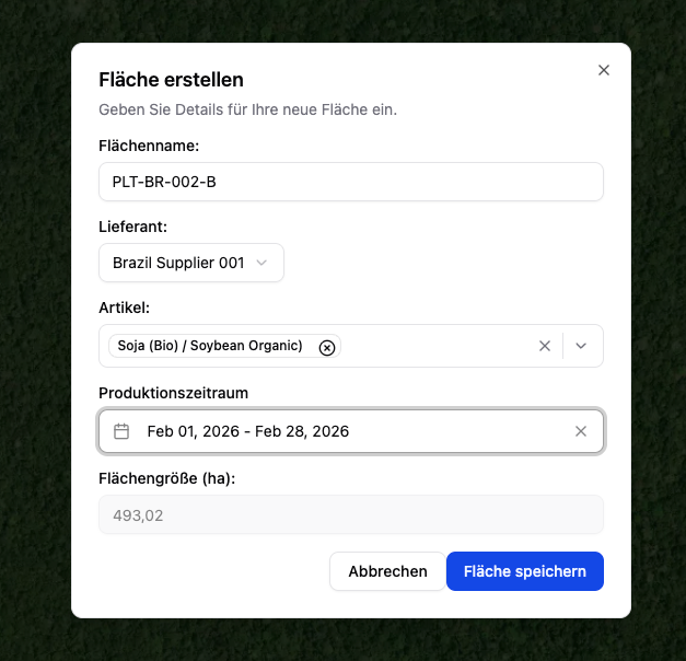 Geben Sie Flächenname, Lieferant, Artikel, ggf. den wissenschaftlichen Namen (bei Holz erforderlich) und Produktionszeitraum ein.