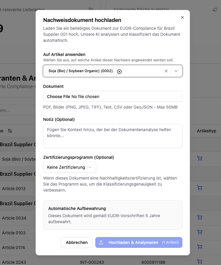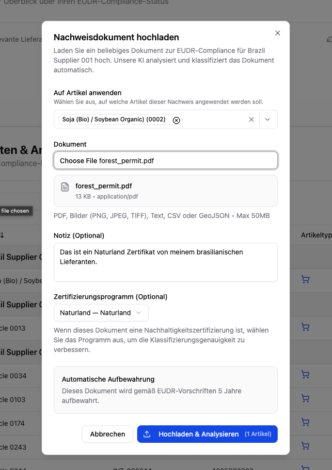 Hochgeladene Dokumente werden gemäß EUDR-Vorschriften automatisch 5 Jahre aufbewahrt.