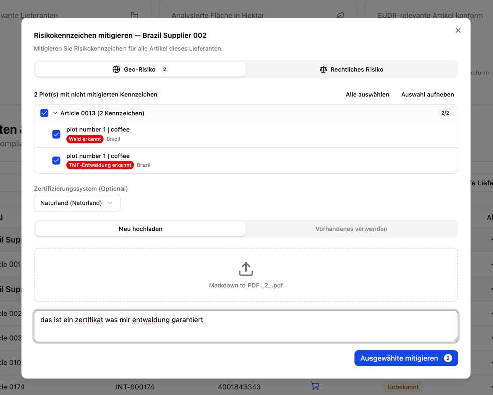 Wenn die Risikoanalyse bei einem Artikel Geo-Risiken (Entwaldung, Degradation) oder rechtliche Risiken erkennt, müssen diese behoben werden. Dafür steht Ihnen der Mitigierungsdialog zur Verfügung — ein zentrales Werkzeug, mit dem Sie Nachweise einreichen, bestehende Zertifikate verknüpfen oder Dokumente direkt vom Lieferanten anfordern können.Der Mitigierungsdialog