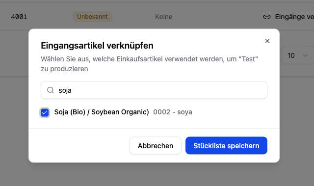Für Verkaufsartikel, die aus eingekauften Materialien hergestellt werden oder direkt weiterverkauft werden, können Sie die Stückliste (Bill of Materials) verknüpfen:- Klicken Sie bei einem Verkaufsartikel auf “Eingänge verknüpfen”.