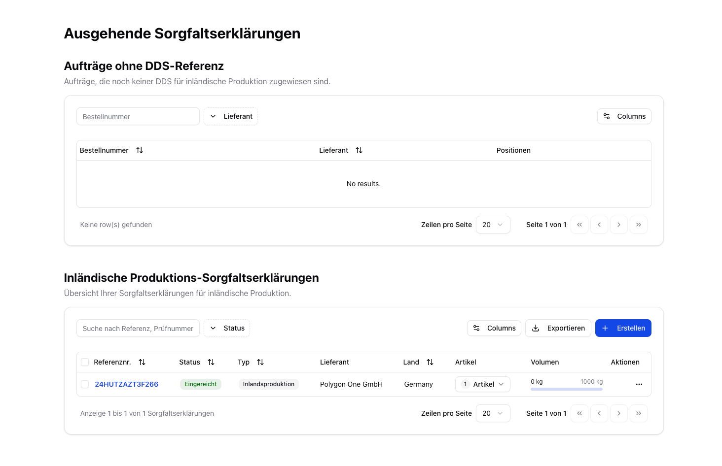 - Inländische Produktions-Sorgfaltspflichterklärungen — Übersicht der erstellten DDS für Eigenproduktion