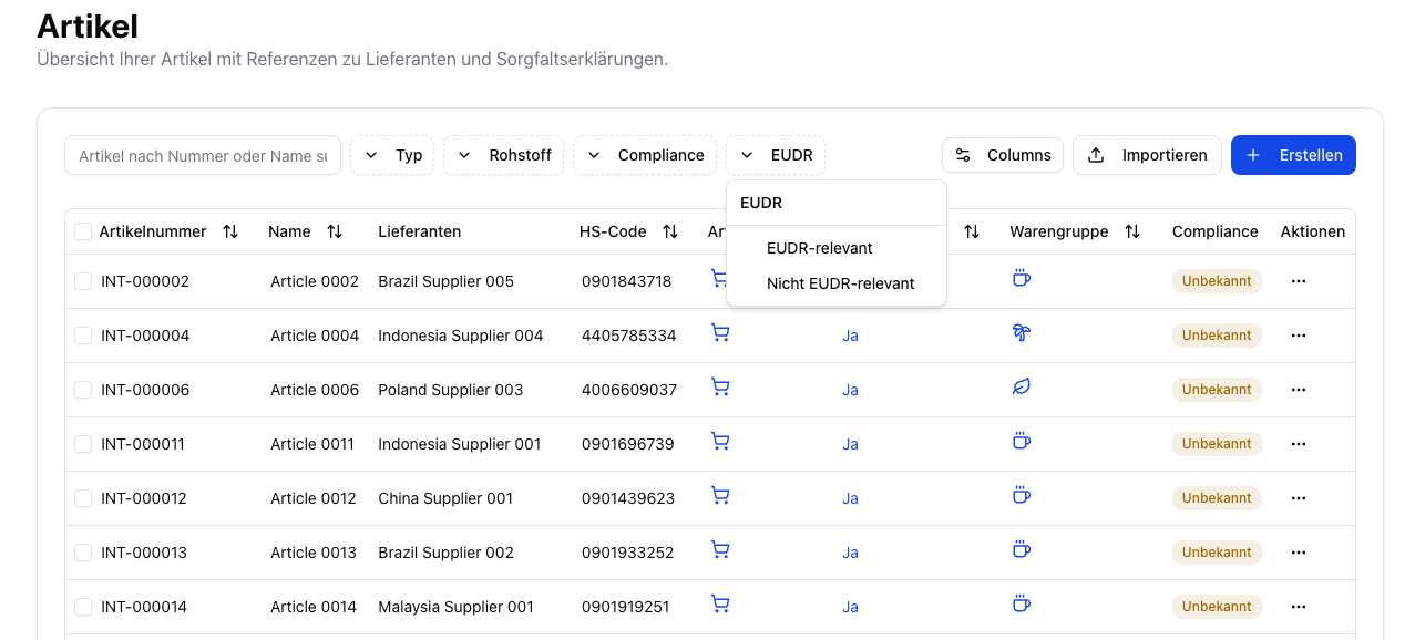 | EUDR-relevant | Der Artikel enthält Rohstoffe, die unter die EUDR fallen. Für diesen Artikel müssen Nachweise gesammelt und eine DDS erstellt werden. |
