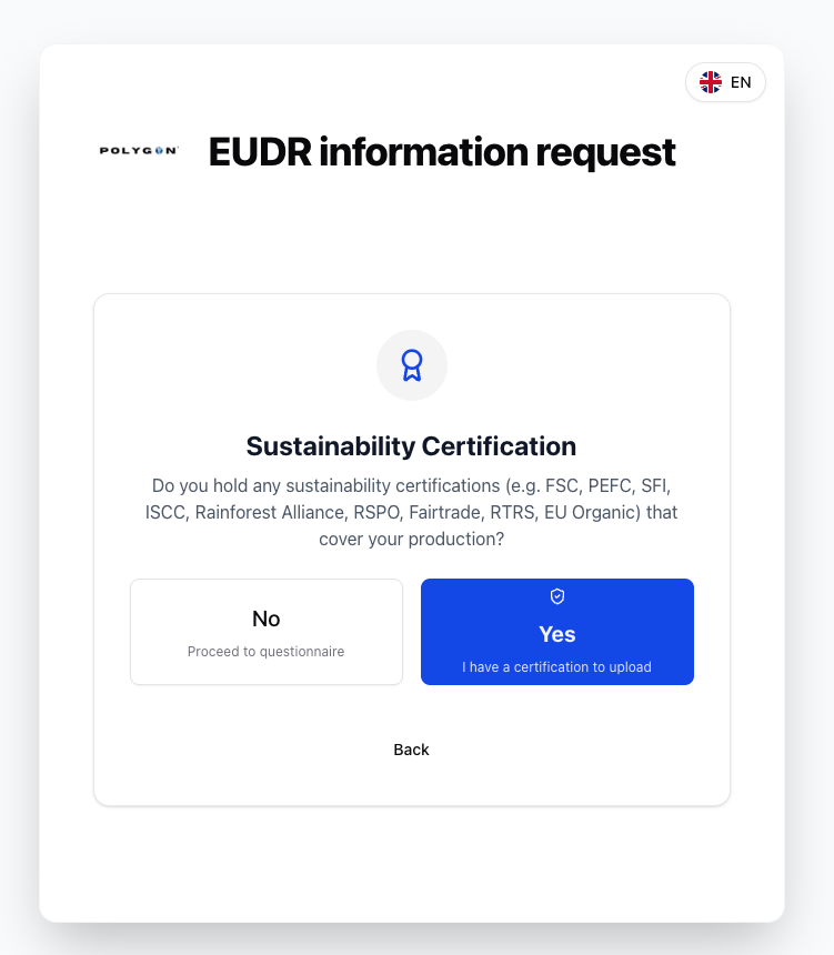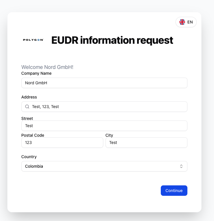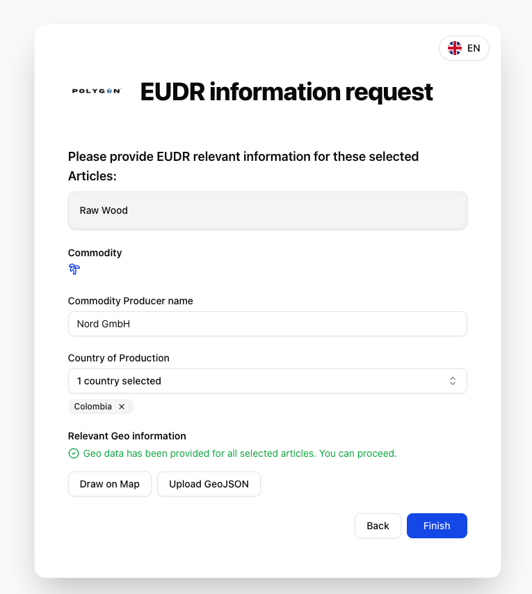Nachdem der Lieferant den Link öffnet, sieht er ein “EUDR information request” Formular.Der Lieferant kann jederzeit die Sprache des Formular ändern. Aktuell unterstützt Polygon One Spanisch, Französisch, Englisch und Deutsch.