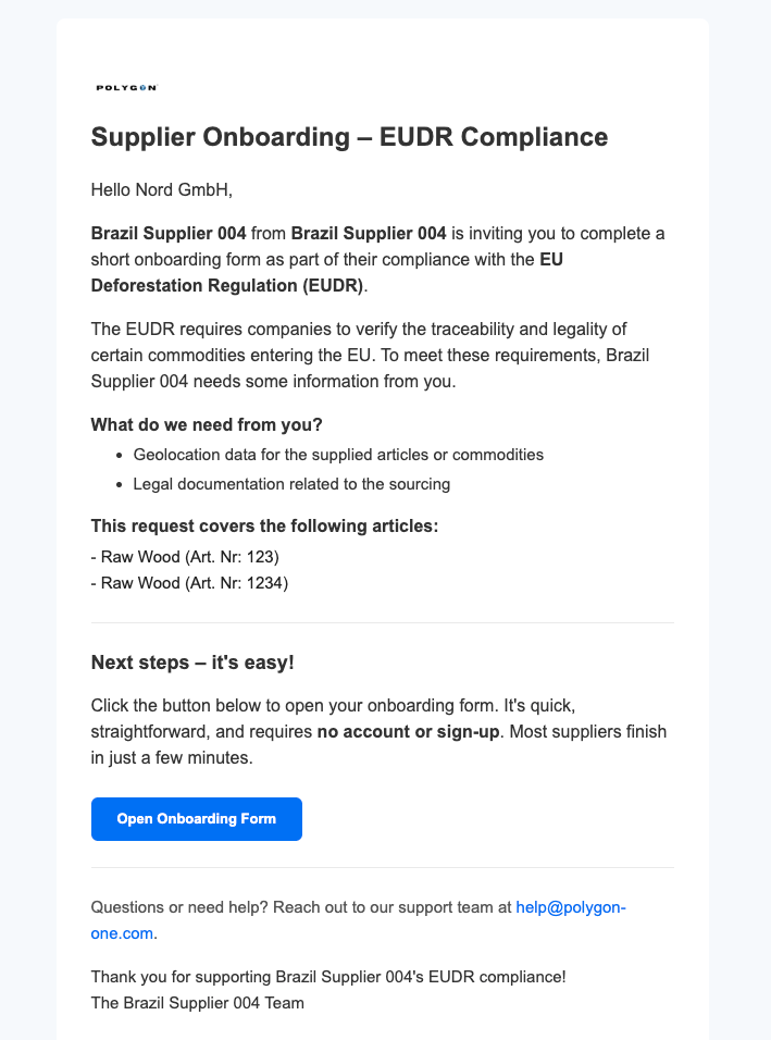 Der Lieferant klickt auf den Link in der E-Mail und sieht eine Nachricht mit dem Titel “Supplier Onboarding - EUDR Compliance” und einer persönlichen Willkommensnachricht.